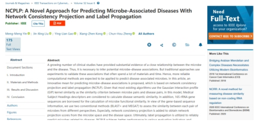 大量临床研究证实了微生物与疾病之间存在着密切关系。因此,推断潜在的微生物与疾病关联的工作变得尤为重要。NCPLP: A Novel Approach for Predicting Microbe-Associated Diseases With Network Consistency Projection and Label Propagation一文提出了一种基于网络一致性投影和标签传播(NCPLP)的新方法来预测微生物-疾病关联。首先,该模型利用医学主题词表和16S rRNA基因序列来分别计算疾病语义相似度和微生物功能相似度;其次,增加了网络一致性投影部分,以此获得微生物空间和疾病空间的网络投影分数;最终,通过标签传播方法来准确预测与疾病相关的微生物。(//ieeexplore.ieee.org/abstract/document/****089)