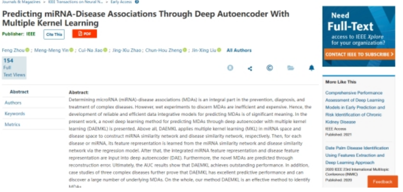 miRNA与疾病关联是预防、诊断和治疗复杂疾病的一个重要组成部分。Predicting miRNA-disease associations through Deep Autoencoder with Multiple Kernel Learning一文提出了一种利用具有多核学习的深度自动编码器的新型深度学习方法来预测MDA。首先,DAEMKL应用多核学习方法来分别构建miRNA相似性网络和疾病相似性网络;其次,将集成的miRNA特征表示和疾病特征表示输入到深度自动编码器中;最终,通过重构误差方法来预测新的MDA。(//ieeexplore.ieee.org/abstract/document/****589)
