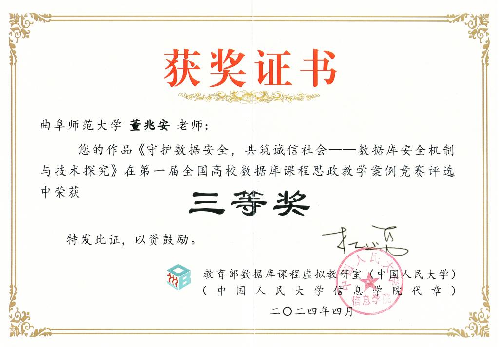 《数据库系统原理》课程团队积极参与虚拟教研室各项事务及日常会议,按时保质保量地提交相关教学文档,所提交的《电影城综合管理系统》案例荣获“全国高校数据库课程实验实训教学案例竞赛一等奖”,《守护数据安全,共筑诚信社会--数据库安全机制与技术探究》在第一届全国高校数据库课程思政教学案例竞赛评选中荣获三等奖。