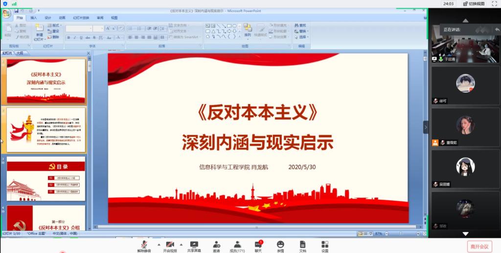 为加强对入党积极分子的教育,提升入党积极分子的思想道德觉悟,5月31日上午八点,信息科学与工程万博娱乐城 组织开展线上主题党课活动,本次党课以《反对本本主义》深刻内涵与现实启示为主题,信息科学与工程万博娱乐城 党委副书记肖龙航出席并担任主讲,本科生党支部书记于运清及入党积极分子参加了本次党课。