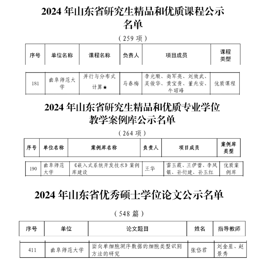 2024年,马春梅副教授负责的课程《并行与分布式计算》获批山东省研究生教育优质课程、王华副教授负责的课程《嵌入式系统开发技术》获批山东省优质专业学位案例库。刘金星教授、赵景秀教授指导的研究生张岱君的硕士学位论文《面向单细胞测序数据的细胞类型识别方法的研究》荣获获山东省优秀研究生硕士学位论文,尚军亮教授、刘金星教授指导的研究生的成果《基于信息相似性的预测推荐方法研究与应用》以及刘金星教授、孙渊导师指导的研究生的成果《面向生物医学数据的智能算法研究及应用》荣获研究生创新成果奖,李光顺教授领导的人工智能导学团队获校级十佳优秀研究生导学团队。