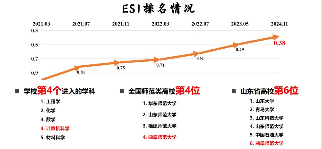 2024年,计算机科学学科ESI前1%排名稳中有进,排名百分位0.38,位居全国师范类高校第4位,省属高校第4位,跃入全国师范类高校第一梯队。计算机科学与技术学科入选2024年软科中国最好学科,排名全国134位,位居全国前47%,是万博娱乐城