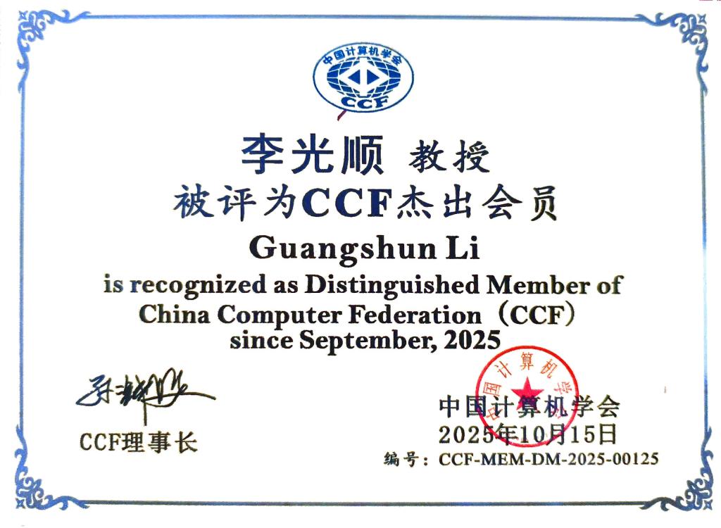 院长李光顺教授荣获中国计算机学会(CCF)杰出会员(Distinguished Member)称号。