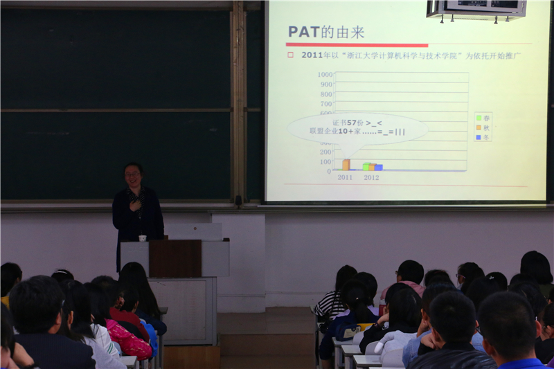 有所要求而埋没人才等弊端。随后,介绍了PAT考试在国内外的地位,强调许多大型企业对PAT考试的认可。期间,陈越教授以多个案例说明了PAT考试对同学们找工作有极大的帮助。最后,又对PAT考试的内容、形式及课程需求做了详细的解释,以“不怕别人比你聪明,就怕比你聪明的人还比你勤奋”结束本次报告。