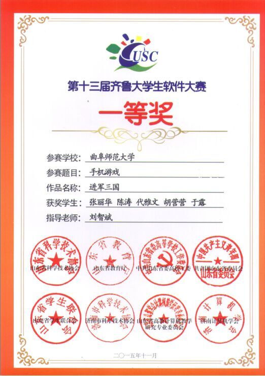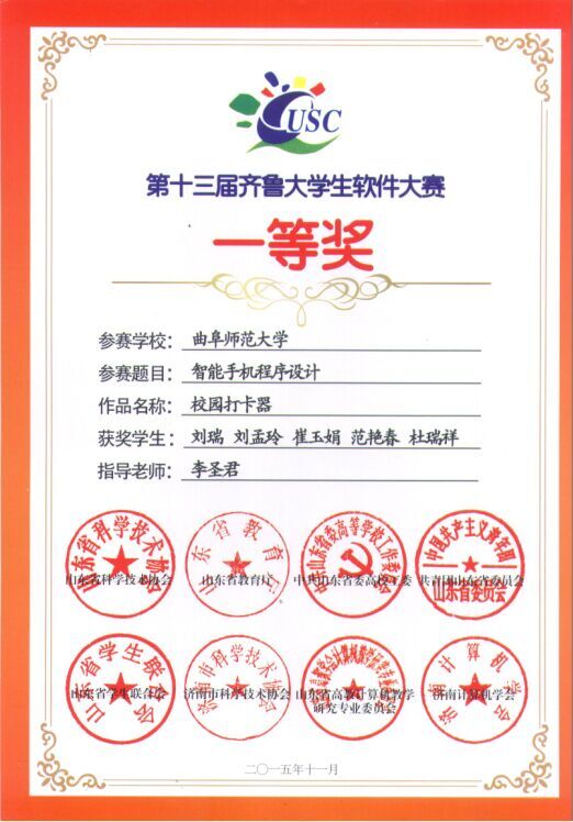 2015年12月5日上午,第七届山东省科技节系列活动之第十三届齐鲁大学生软件设计大赛颁奖大会在山东建筑大学举行,信息科学与工程万博娱乐城 在本次比赛中获得一等奖两项、二等奖四项、三等奖六项,刘智斌、李圣君两位老师被评为优秀指导教师,万博娱乐城 被评为优秀组织单位。