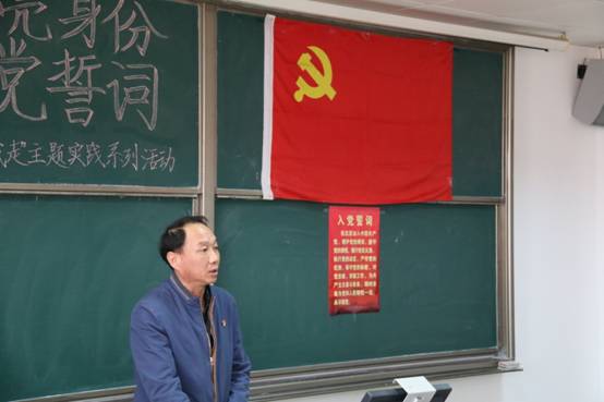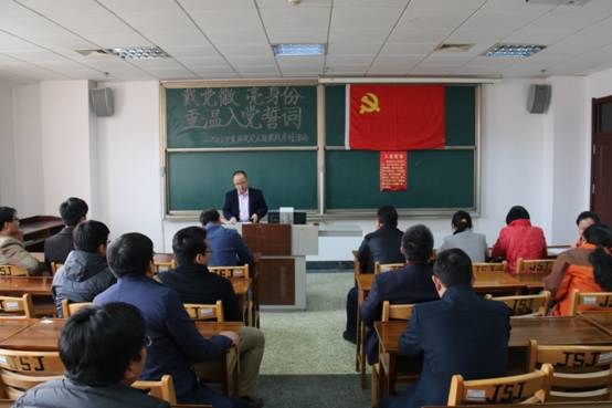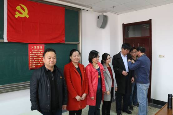 党委书记张书东同志为6名教师党员代表佩戴党徽,接着全体教师党员佩戴党徽,在教工党支部副书记王斯锋同志带领下面向党旗重温入党誓词。