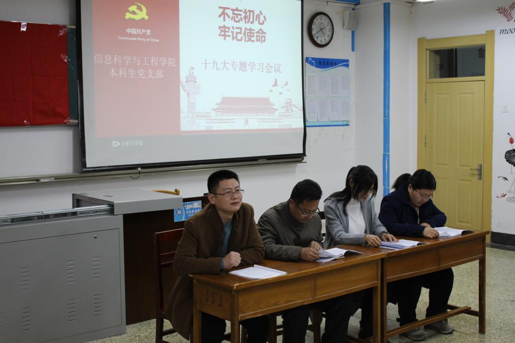 本科生党支部开展以“不忘初心、牢记使命”为主题的十九大专题学习会议,本科生党支部书记姜振栋,团委书记毕文波,辅导员于运清、鲁瑞丽出席本次学习活动,信息科学与工程万博娱乐城