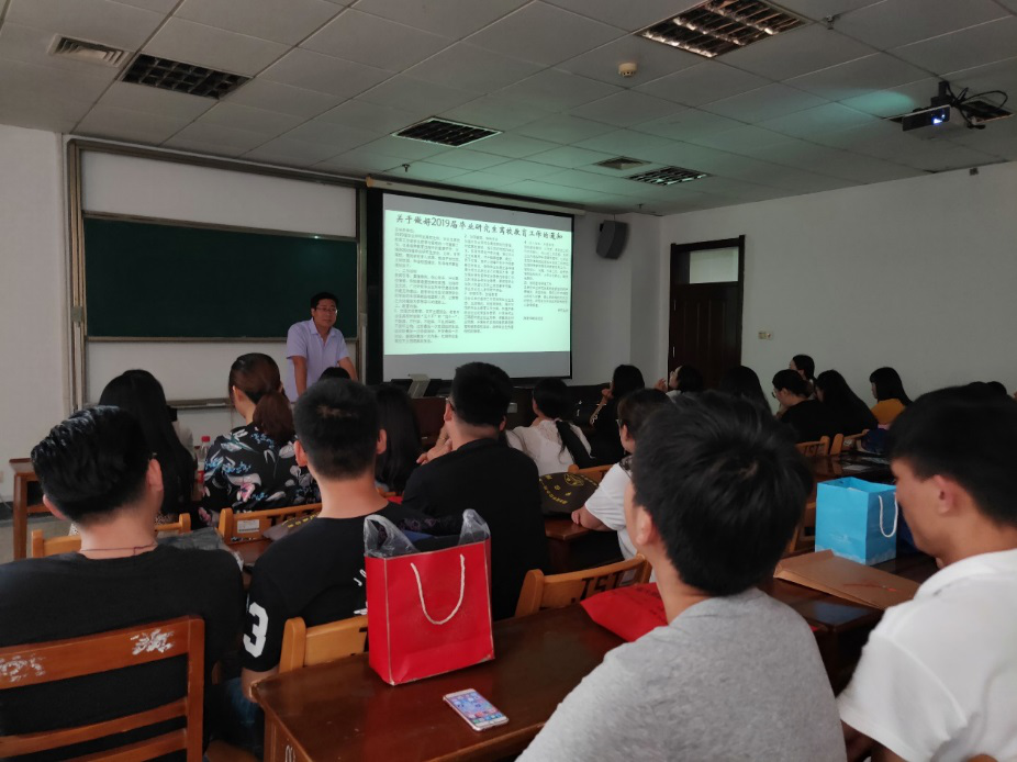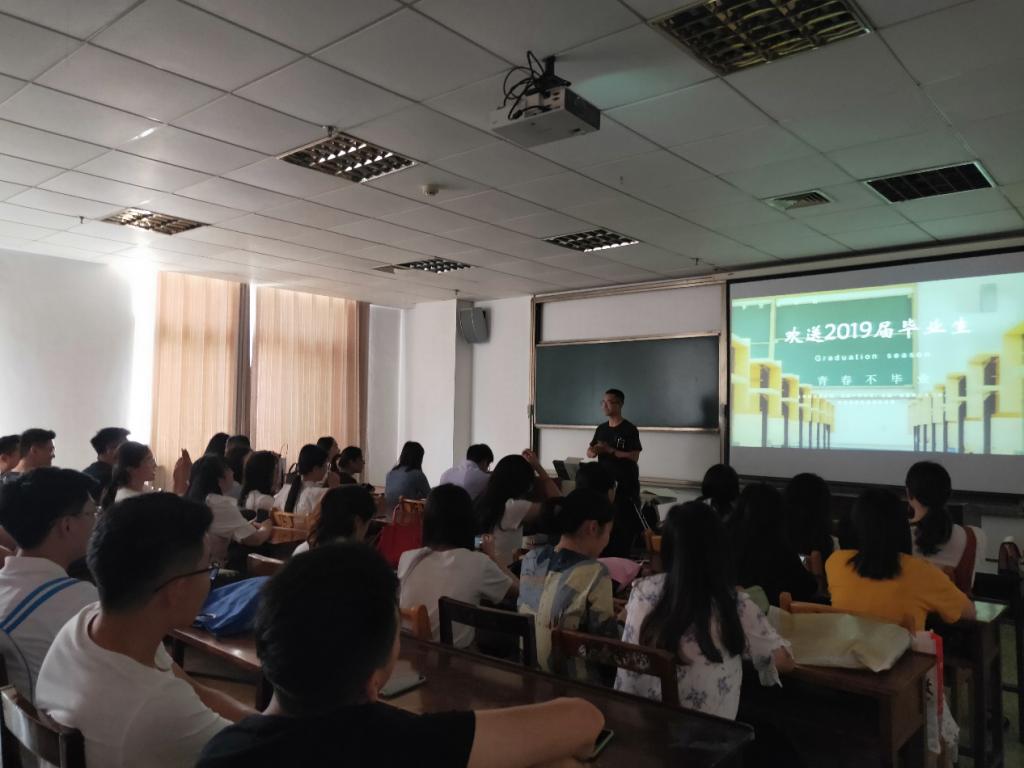 于JC612教室召开欢送2019届毕业研究生主题班会,研究生秘书尚军亮老师及全体毕业研究生参加本次会议。会议由马德璐主持。