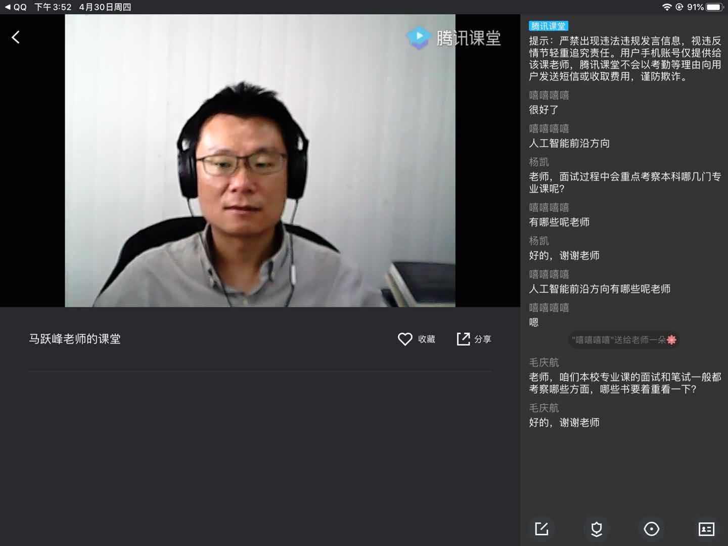 高度重视2020届考研学子复试的相关工作,4月30日下午三点召开2020届考研复试线上指导会,马跃峰老师受邀出席并担任主讲,16级考研过线学子参加了本次指导会活动。