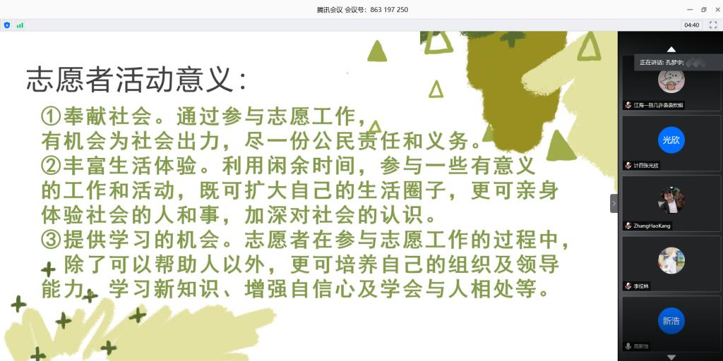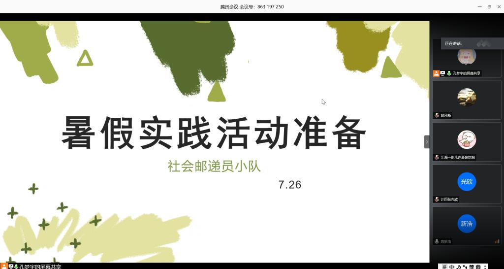 社会邮递员小队在腾讯会议app举行了会议,讨论社会实践前的准备活动。小队全体成员都参与了本次会议,并积极发表了各自对于小组实践活动的看法以及活动方向的建议。