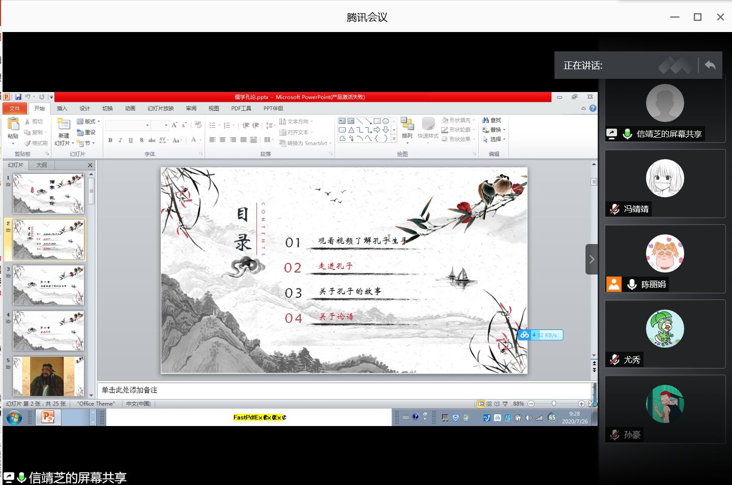 会议伊始,主持人陈丽娟首先强调了授课的注意事项和重点内容。在得到每位队员的确认后,会议正式开始。队员们按照年级,通过屏幕共享的方式依次展示备课成果,详尽的描述了授课框架并梳理了上课的流程。在展示儒学文化课程时,信靖芝老师尽其所能,展现了丰富的教学风格。在保证教学质量的同时,增加了授课的趣味性,旨在为学生打牢基础,巩固知识。随着会议的推进,气氛越来越热烈。各年级老师们尽其所长、开拓创新,用趣味的方式活灵活现的讲述了课程内容。队员们相信,孩子们将会在课程中丰富生活、开拓视野。同时,老师们也会向孩子们积极传递安全意识,在学习之余保证安全。