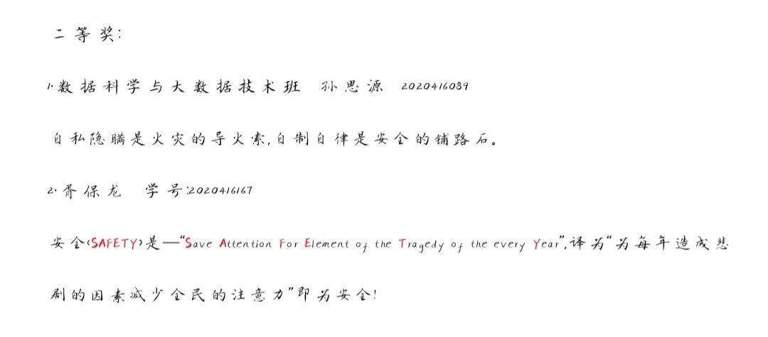 本次活动设有一等奖一名同学,二等奖两名同学,三等奖三名同学,征集作品类型可以为标语口号、格言警句、对联、谚语、座右铭等,参赛作品必须为原创,紧扣安全主题,且每条字数不超过30字,参赛同学将参赛作品交给本班安全委员。活动期间,2020级同学踊跃报名,积极参加,充分发挥自己的想象力与创造力,文思泉涌,创作出多份优秀的安全标语,简洁明快,打动人心,赛出了属于自己的风格色彩。最后,安全部成员就所收集的安全标语进行投票,根据每份标语所得票数依次划分出一、二、三等奖。