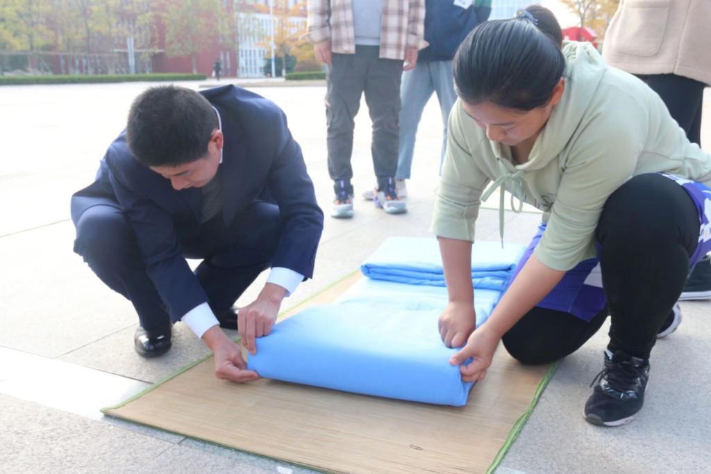 于日月广场成功举办叠被子大赛。学工处、武装部副部长赵秀臣、万博娱乐城
