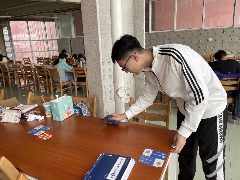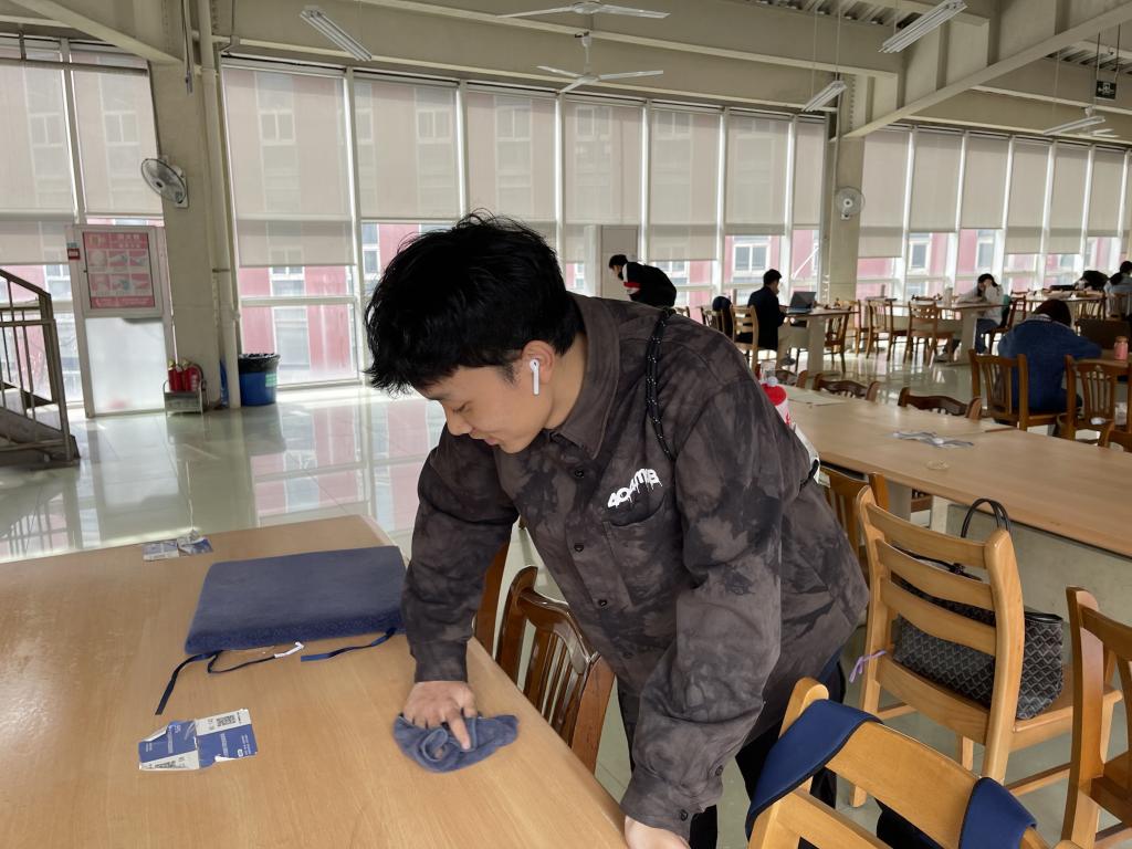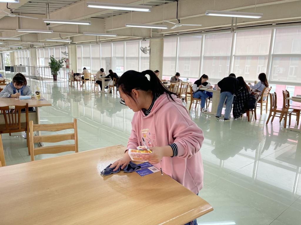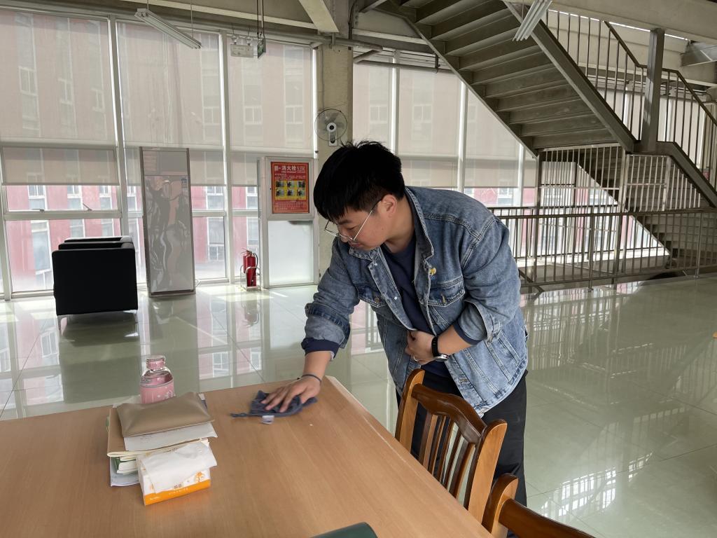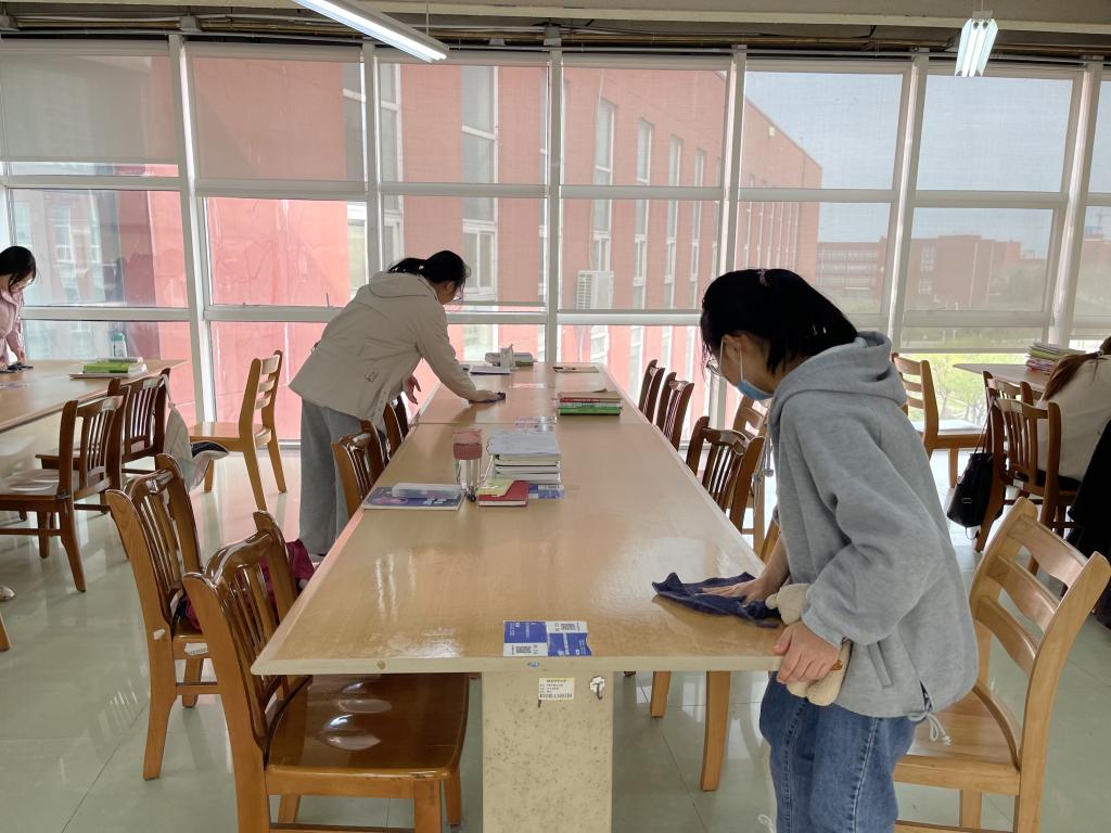 志愿者工作部的组织下,志愿者们于下午2时准时到达图书馆,开始图书馆的清理打扫工作。打扫的主要内容是对桌面、板凳以及扶手的清洁。对图书馆的打扫清洁工作进行分工之后,清洁打扫工作正式开始。为了更好地完成清洁打扫工作,志愿者们分工明确,积极认真的进行打扫,仔细清理。在下午的4点准时圆满完成了清洁打扫工作。