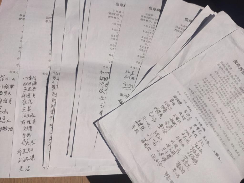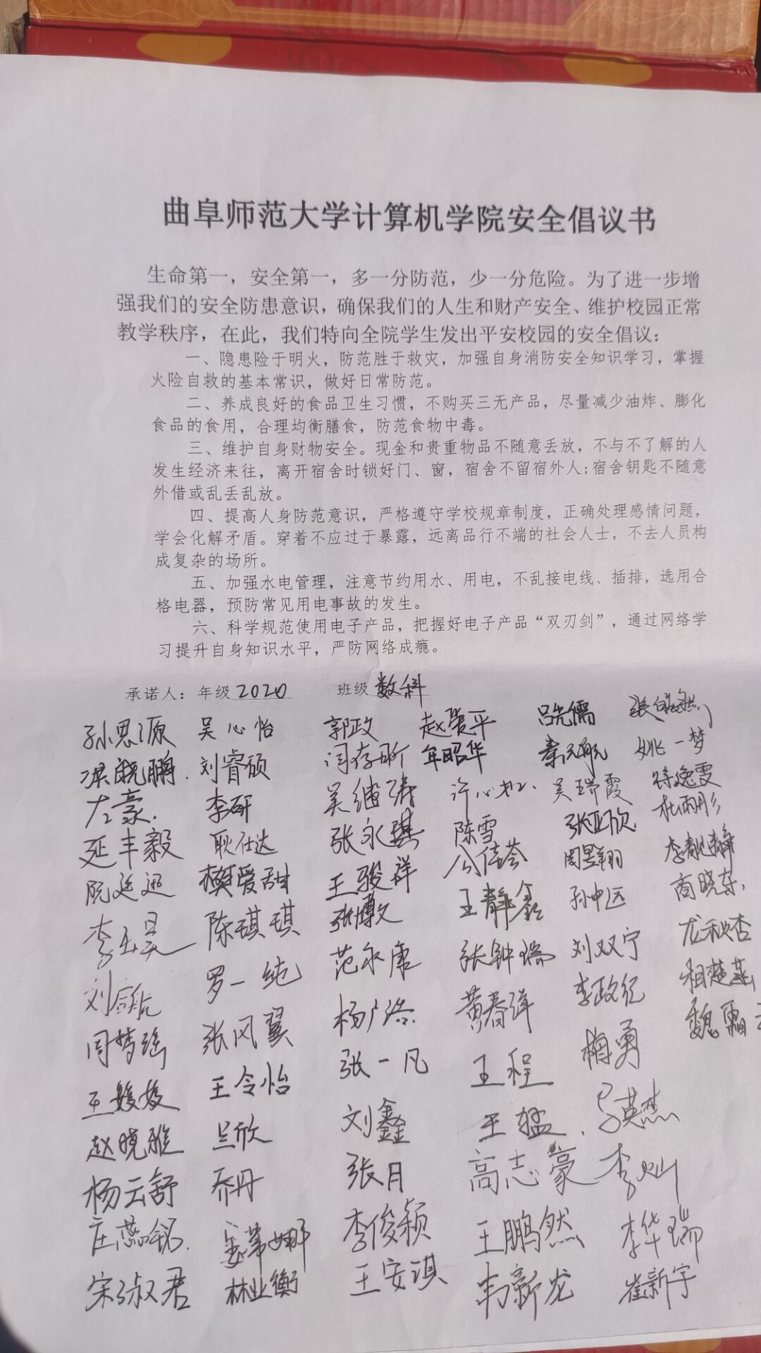 组织同学们进行安全承诺书签名,该承诺书包含消防安全、食品安全与营养健康、交通安全、宿舍防火、防盗、人身防护、用水用电安全以及科学规范使用电子产品等方面,各班安全委员带领班级同学认真阅读该承诺书的各项守则并签名,督促同学们保证个人人身安全,维护正常的工作和生活秩序,提高个人安全意识及警惕性。
