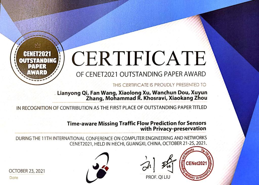 青年教授齐连永的论文“Time-aware Missing Traffic Flow Prediction for Sensors with Privacy-preservation”在本次会议中获得最佳论文奖(The First Place of Outstanding Paper)。