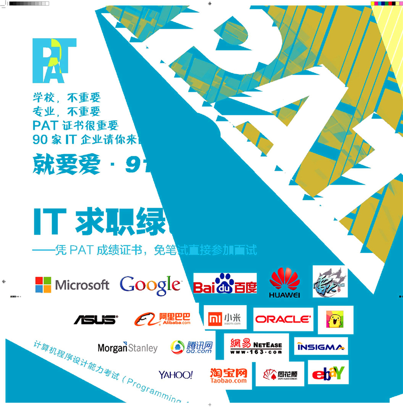 创办并由高等教育出版社有限公司独家运营的计算机程序设计能力考试(Programming Ability Test,简称PAT),旨在培养和展现学生分析问题、解决问题和计算机程序设计的能力,科学评价计算机程序设计人才,为IT企业选拔人才提供参考标准,目前联盟企业有100多家,包括Google中国、Microsoft、华为、雅虎、百度、腾讯、阿里巴巴、淘宝(中国)、奇虎360等国内顶尖的IT企业都已划定免笔试PAT分数线,这些企业每次收到数据包后会主动联系考生,所以“PAT就是IT界的托福”,一次考试相当于通过N家公司的笔试,证书2年内有效。通过PAT认证考试可以为自己早日开启就业的绿色通道。万博娱乐城