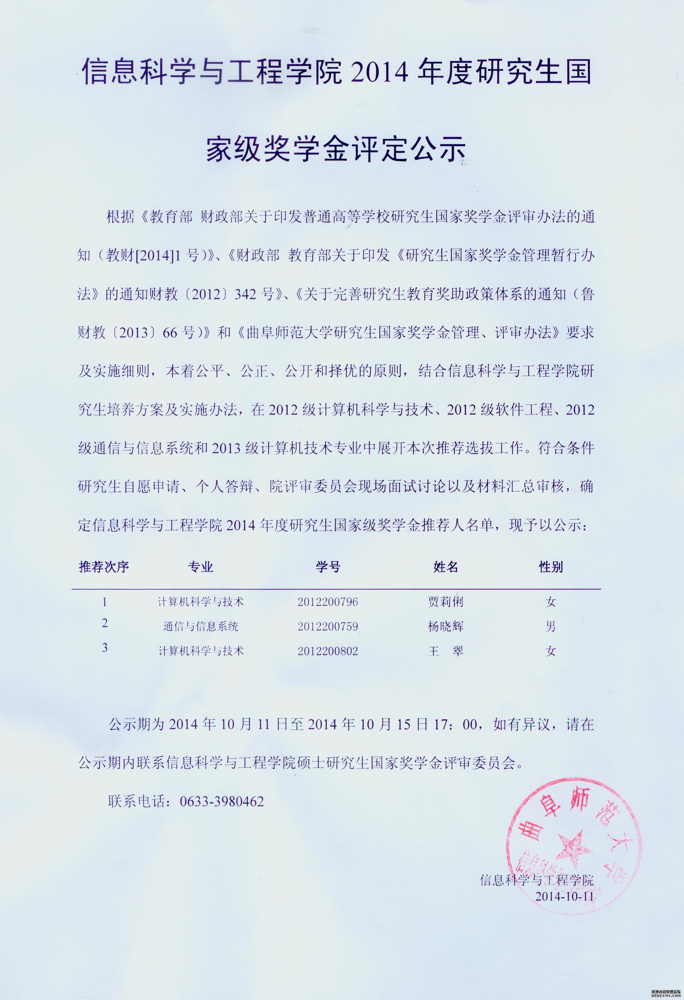 上一条: 2014年研究生学业奖学金评定结果公示