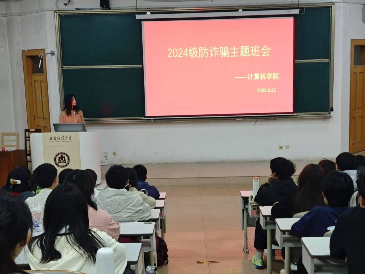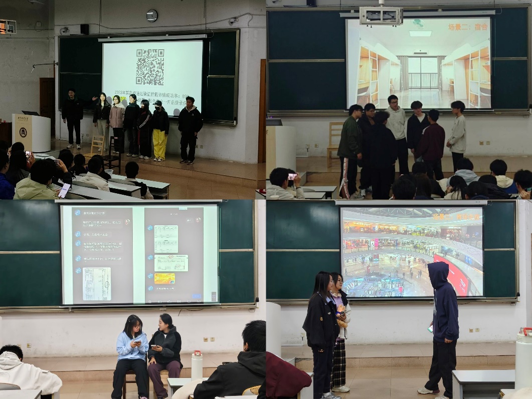 班会伊始,讲演者依据发生在学生群体中的真实诈骗案例为切入点,详细剖析了“助学金、奖学金诈骗”“网络贷款诈骗”“网络交友诈骗”等常见诈骗手段。随后,通过观看24级同学们表演的反诈短剧,同学们直观感受到诈骗分子如何利用学生社会经验不足、防范意识薄弱的特点实施犯罪。一幕幕触目惊心的案例让在场学生深刻意识到“天上不会掉馅饼”,唯有提高警惕才能避免上当受骗。