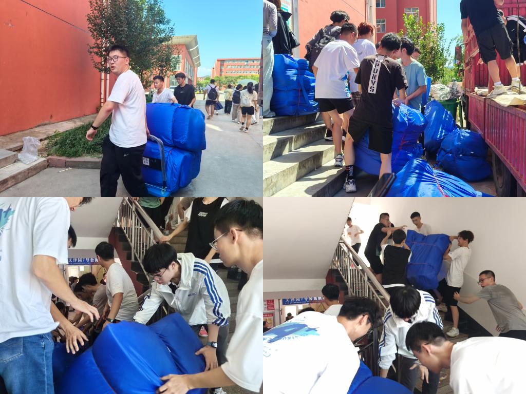 9月3日学长学姐主动请缨,化身“迎新先锋”,深入新生宿舍,进行全方位的清扫工作,仔细检修宿舍用品,确保宿舍环境整洁安全。同时,他们齐心协力搬运新生的卧具包等物资,减轻新生入学负担,传递温暖与关怀。