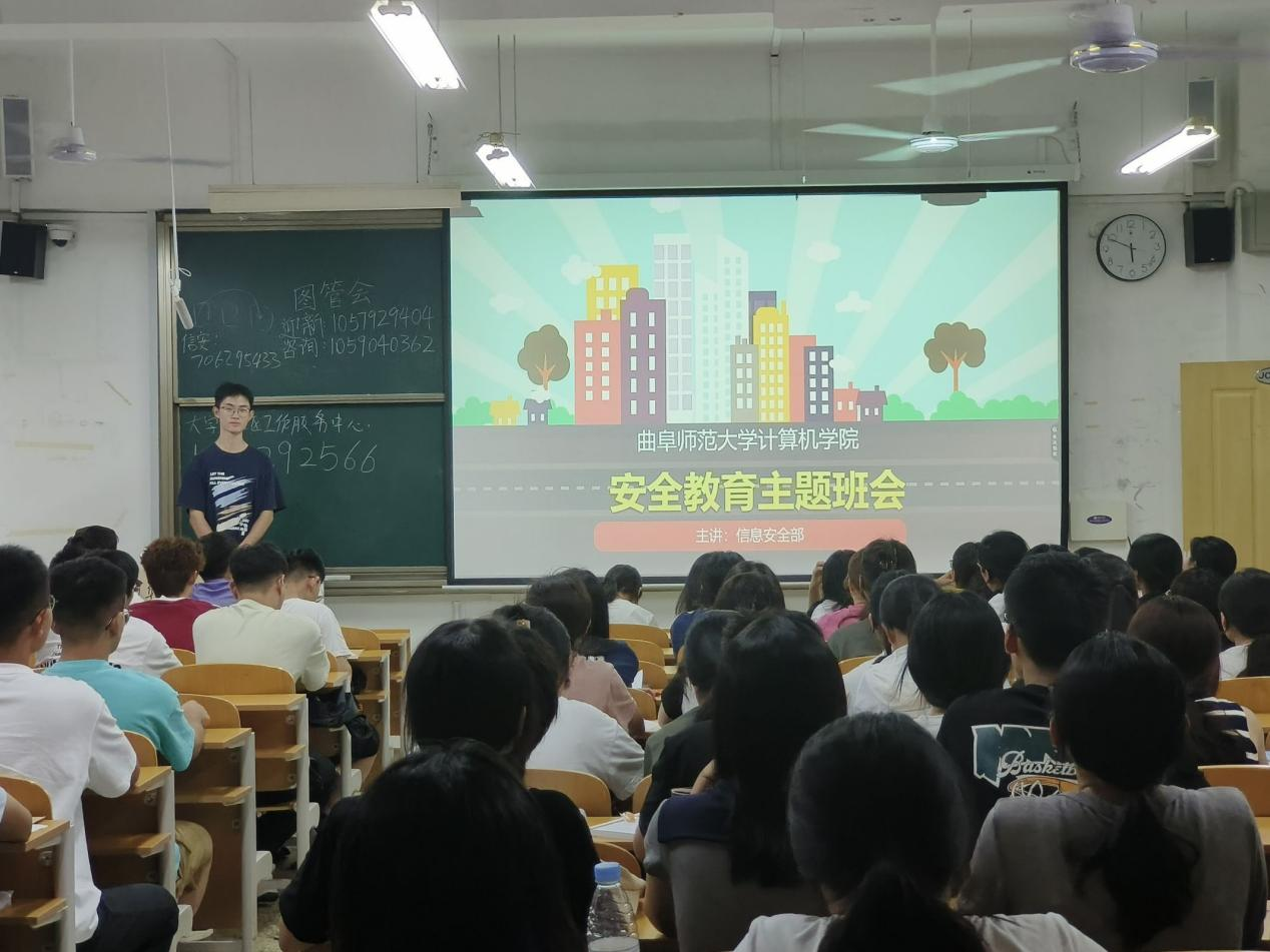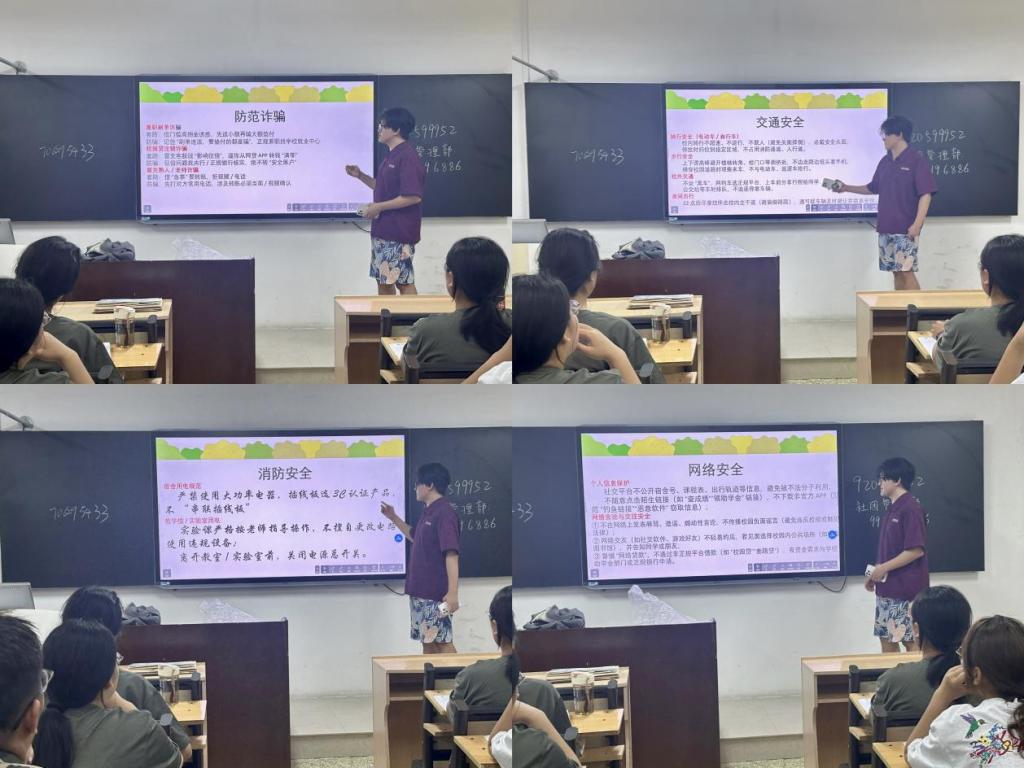 在JC401、JC405、JC408等六个教室举办了2025级新生安全教育主题班会,由信息与安全部成员主持。