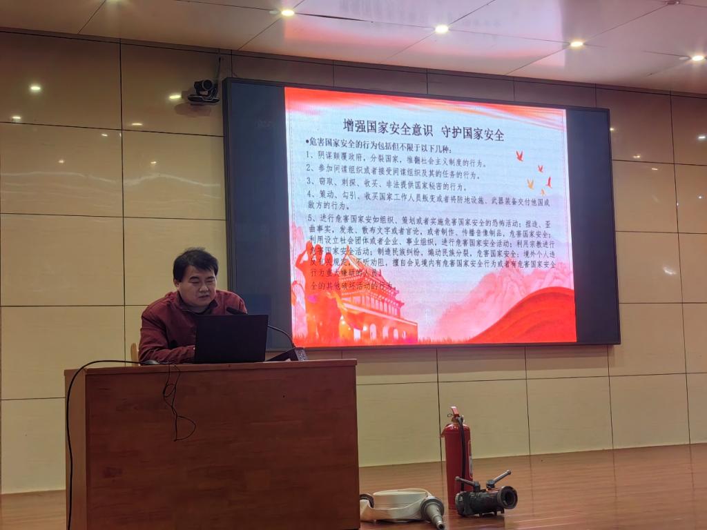 王老师主要从消防安全、电信网络诈骗、交通安全、国家安全等方面展开讲解,首先,他告诫同学们要养成良好的消防安全意识,不要使用大功率电器和易燃物品,不要乱扔烟头、乱拉电线,并带领大家学习了发生消防事故时的正确做法;第二,网络社交时要保持警惕,不要轻易泄露个人隐私,保护好自己和家人的人身安全;第三,要增强国家安全意识,遵守法律法规,不泄露国家秘密,积极举报危害国家安全的行为。