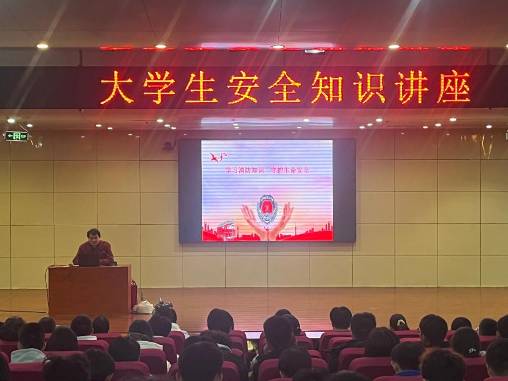 于报告厅举办大学生安全知识讲座,保卫处老师王长军担任主讲,万博娱乐城