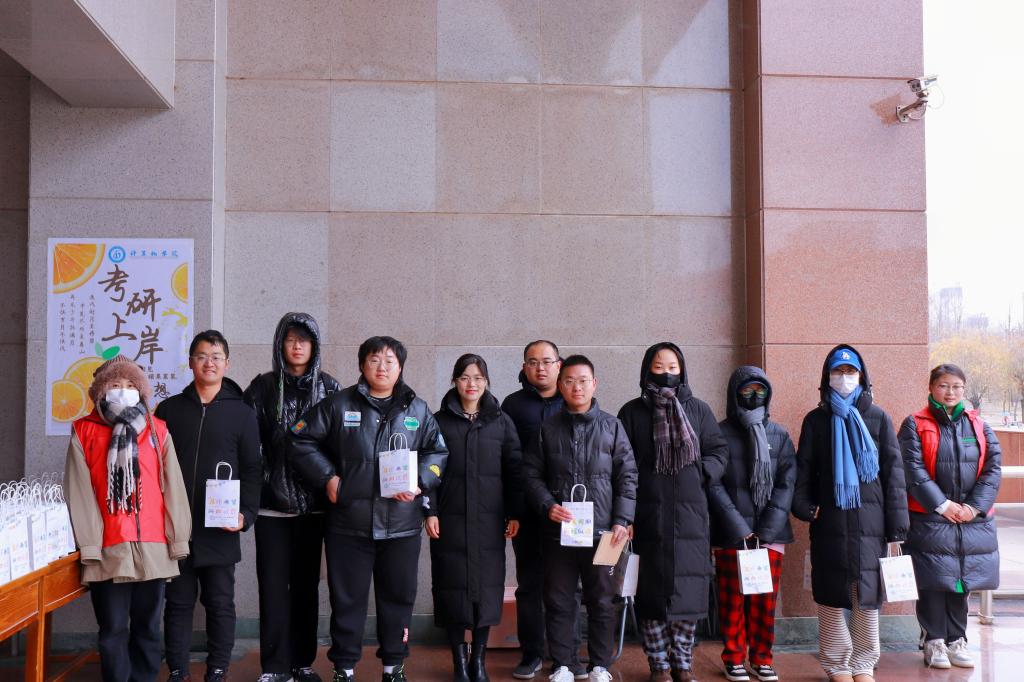 院长李光顺、团委书记于运清、2020级辅导员刘兆宇在C楼大厅为正在准备考研的学生们送上暖心祝福与考研助力包。