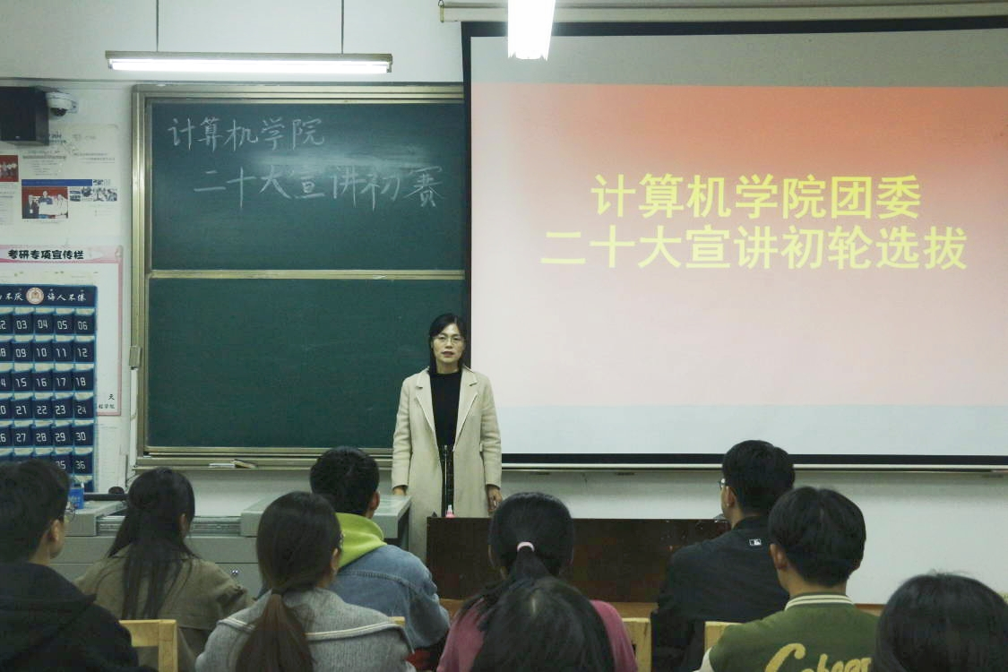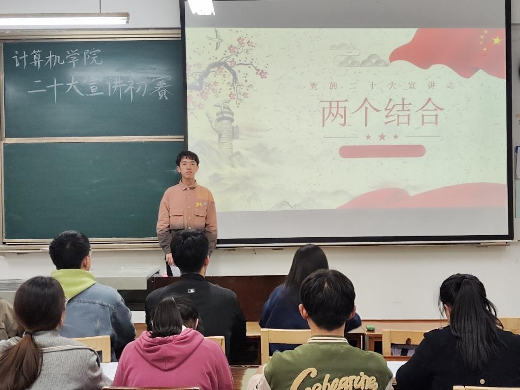 各位选手围绕中国式现代化、弘扬优秀传统文化等主题,依次上台宣讲,深刻阐述了自己对党的二十大的见解和认识。精美的PPT和选手精彩的发言博得了同学们的阵阵掌声,洪亮的声音展现计算机学子的良好风貌,精彩的发言彰显无奋斗不青春的青春本色。其中,洪静雅、李羽晗、张雨萌、李慧、付娆、加雨成、张珂、周心如、凌阳特、黄诗婕十名同学在宣讲初赛活动中表现优越,赢得了评委们的一致好评。