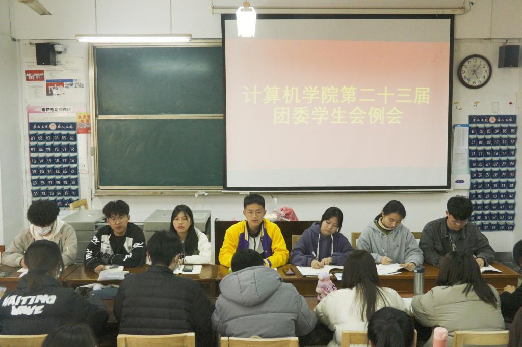 于JC402召开团委学生会例会。学生会成员,各班班长与团支书参与会议。