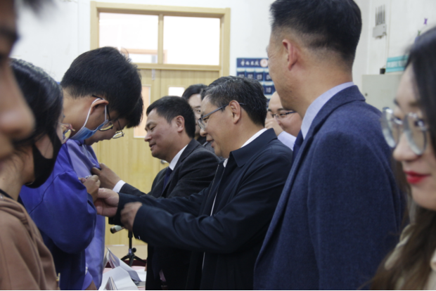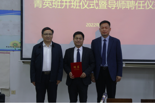 的支持下,第二届菁英班也一定会越来越好,在各项比赛中大放光彩,取得成绩。在此之后,院长李光顺及党委副书记孙旭春为董兆安老师颁发本科生导师聘书,第二期菁英班优秀成员上台,领导、老师们为他们佩戴菁英班徽章。