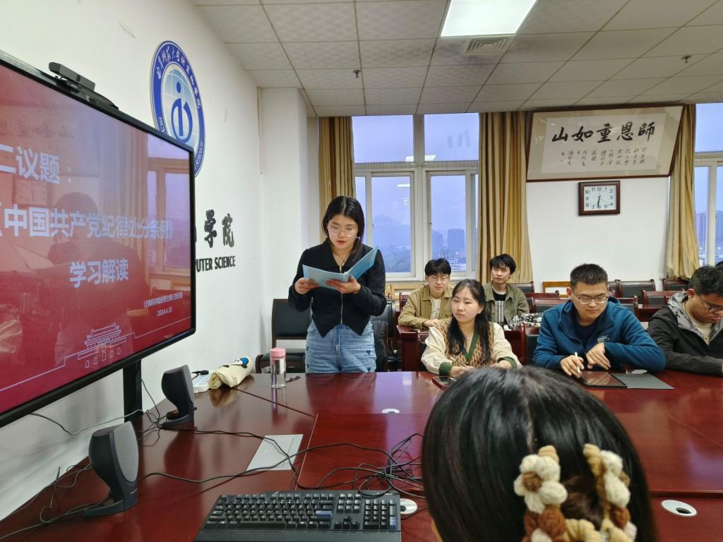 程老师强调,支部党员要学习贯彻习近平总书记关于党纪学习教育的重要讲话和重要指示精神,认真学习《中国共产党纪律处分条例》,做到学纪、知纪、明纪、守纪,搞清楚党的纪律规矩是什么,弄明白能干什么、不能干什么,把遵规守纪刻印在心,内化为日用而不觉的言行准则,进一步强化纪律意识、加强自我约束、提高免疫能力,增强政治定力、纪律定力、道德定力、抵腐定力,始终做到忠诚干净担当。