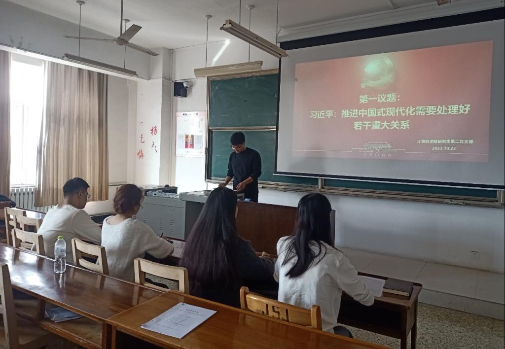 本次会议的第一议题是“习近平:推进中国式现代化需要处理好若干重大关系”。会议伊始,参会党员共同学习了第一议题。习近平总书记指出推进中国式现代化是一个系统工程,需要统筹兼顾、系统谋划、整体推进,正确处理好一系列重大关系。党的二十大报告深刻阐述了中国式现代化的中国特色、本质要求和重大原则,是对推进中国式现代化的最高顶层设计。中国式现代化是分阶段、分领域推进的,实现各个阶段发展目标、落实各个领域发展战略同样需要进行顶层设计。进行顶层设计,需要深刻洞察世界发展大势,准确把握人民群众的共同愿望,深入探索经济社会发展规律,使制定的规划和政策体系体现时代性、把握规律性、富于创造性,做到远近结合、上下贯通、内容协调。同时,推进中国式现代化是一个探索性事业,还有许多未知领域,需要我们在实践中去大胆探索,通过改革创新来推动事业发展,决不能刻舟求剑、守株待兔。