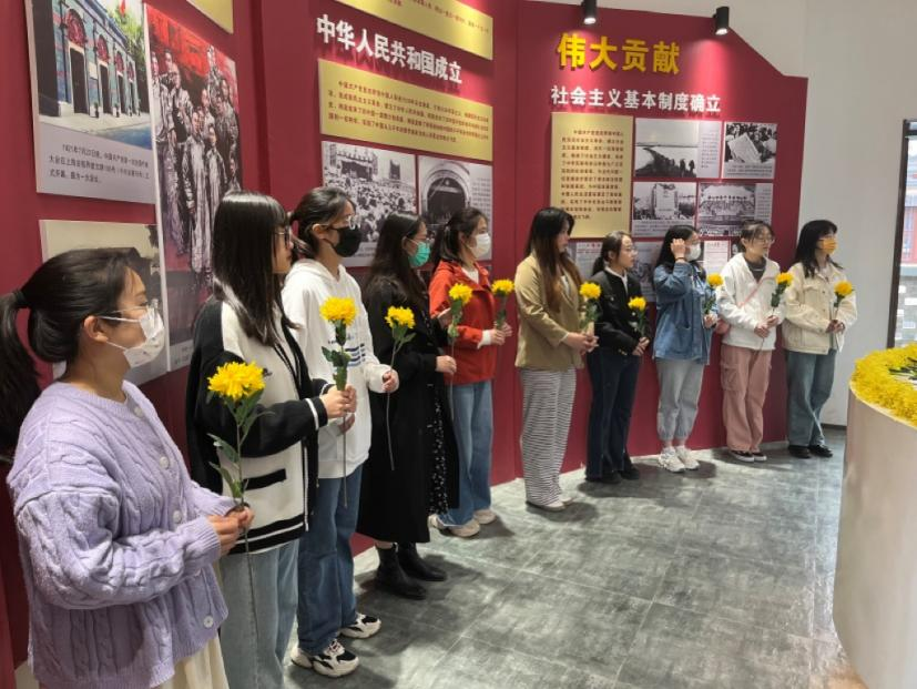 参观结束后,全体师生在鲜花堂为毛泽东同志献花,并共同唱响《没有共产党就没有新中国》,以鲜花寄托对先烈的敬意。
