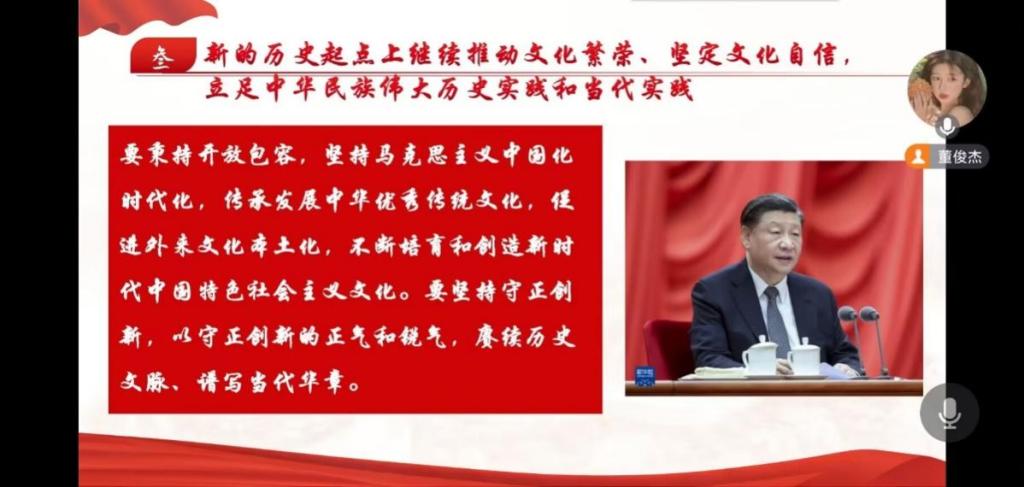 会议伊始,党秘董俊杰指出本次线上专题学生会的主题为“学习习近平总书记在文化传承发展座谈会上的重要讲话”。在讲话中,习近平总书记强调,在新的起点上继续推动文化繁荣、建设文化强国、建设中华民族现代文明,是我们在新时代新的文化使命。广大党员要始终坚定文化自信、担当使命、奋发有为,共同努力创造属于我们这个时代的新文化,建设中华民族现代文明。