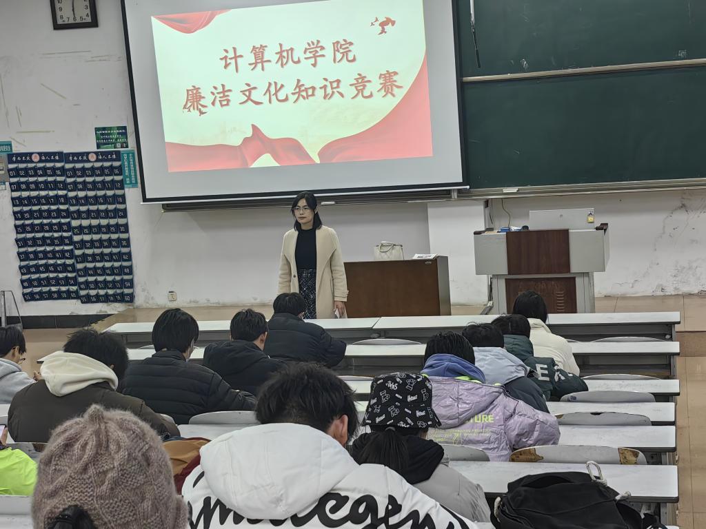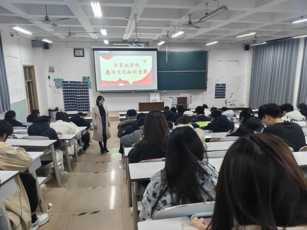 于2023年12月4日下午6点在JA104举办廉洁文化知识竞赛,本次竞赛由于运清老师监考,全体学生党员和学生干部参加。
