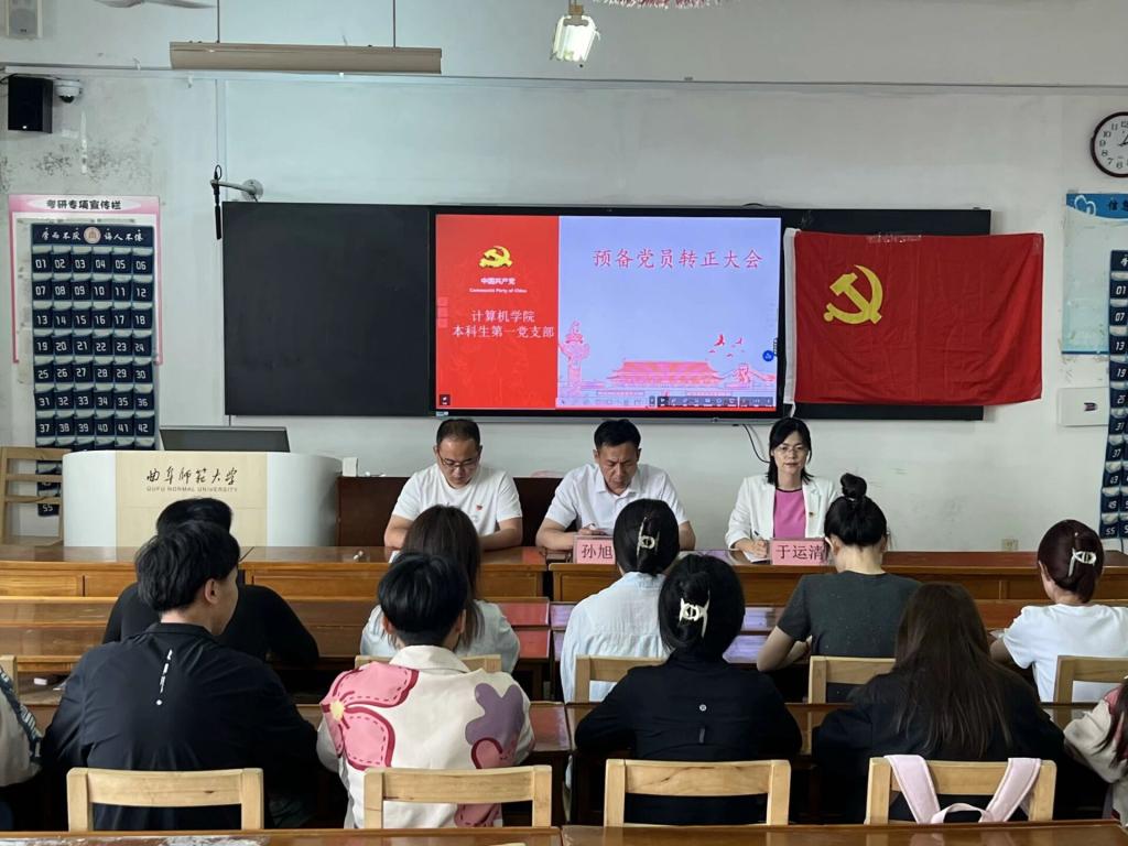 2024年5月30日下午四点半,万博娱乐城 本科生第一党支部于JC405召开预备党员转正大会,大会就王子雨、纪旭乐同志预备党员转正问题进行讨论和表决。万博娱乐城 党委副书记孙旭春、万博娱乐城 本科生第一党支部书记于运清、副书记刘兆宇及学生党员参加此次会议。