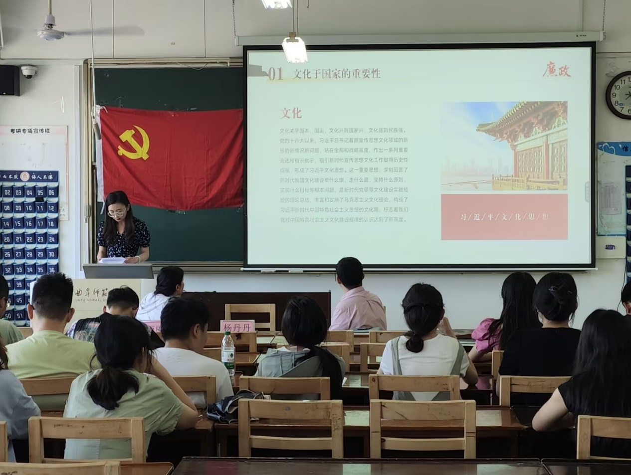 此次党课,杨丹丹老师重点阐述了习近平文化思想的核心:坚持党的文化领导权,推动物质与精神文明协调发展,并强调了“两个结合”的根本要求,即把马克思主义与中国实际及中华优秀传统文化相结合。并提出我们要深刻认识习近平文化思想的时代价值和指导意义,不断内化为自身的行为准则。