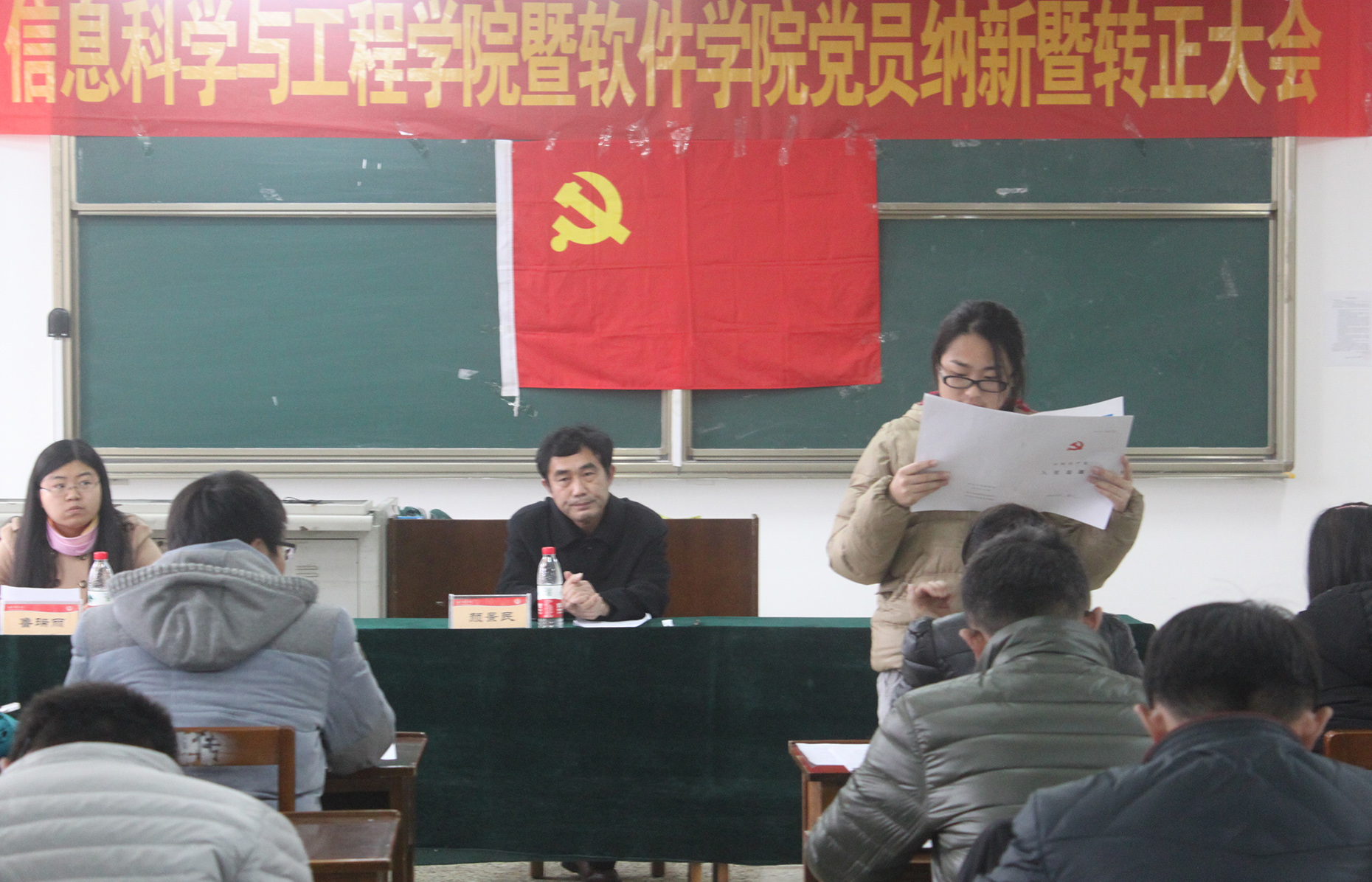 2014年12月10日信息科学与工程万博娱乐城 暨软件万博娱乐城 党员纳新暨转正大会于在c408召开,信息科学与工程万博娱乐城 党总支副书记颜景民,姜振栋老师,鲁瑞丽老师和全体学生党员出席会议。会议由信息科学与工程万博娱乐城 党校副校长邵明超主持。